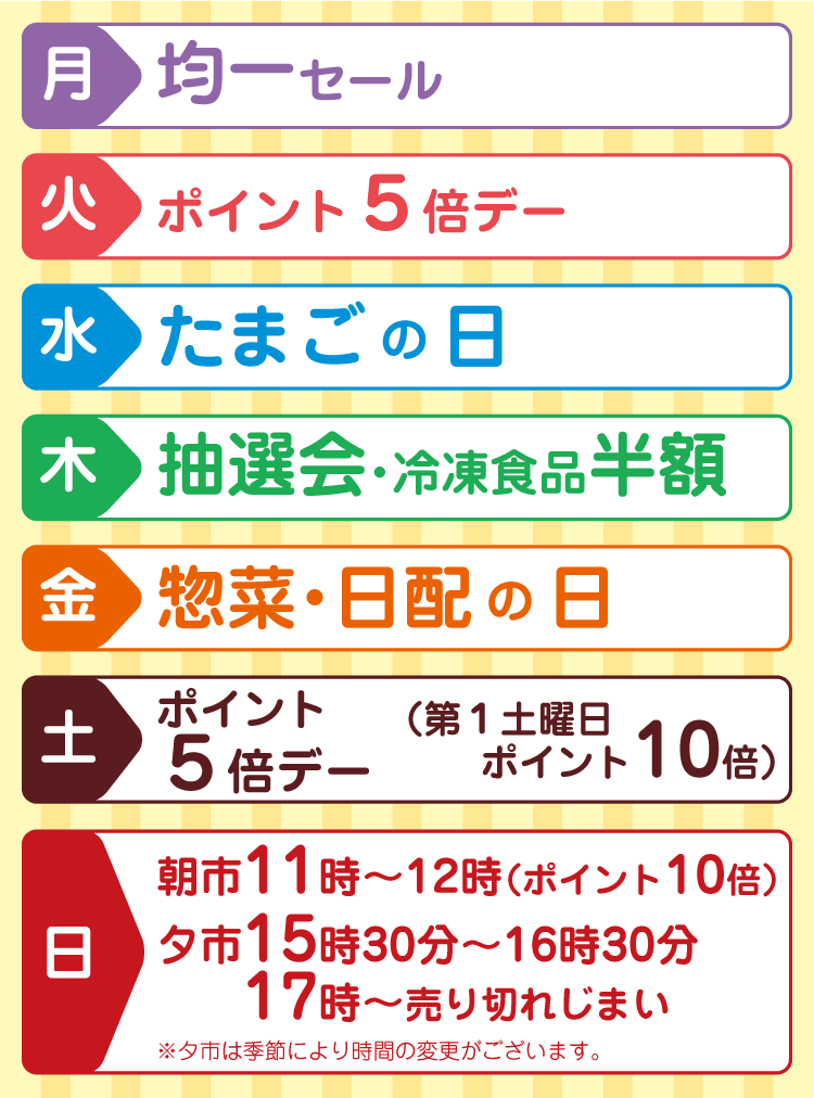 スーパーマーケットハリガエでは、曜日毎にお得なサービスを実施しています。